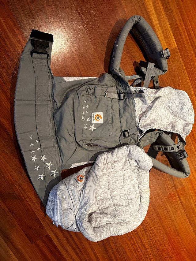 Mochila de porteo de la marca Ergobaby con un bonito estampado de estrellas en tonos grises. Incluye un reductor para recién nacidos.