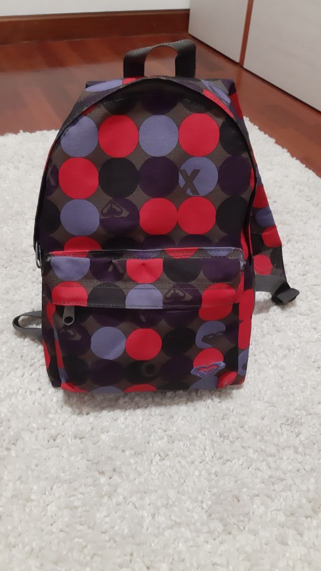 Mochila pequeña de roxy de círculos en tonos oscuros azul y fucsia, con bolsillo pequeño fuera y pasas regulables