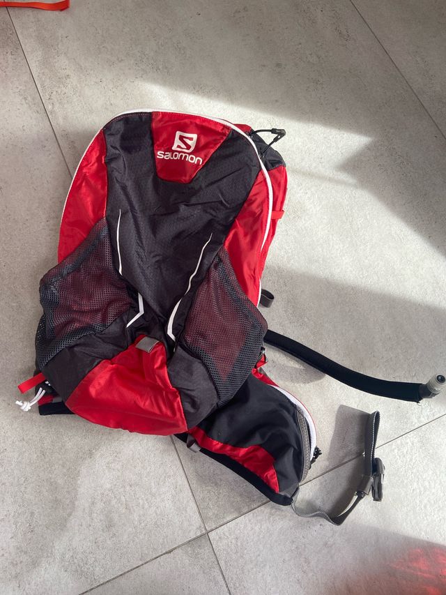 Mochila de senderismo y trail running Salomon Agile 17. - Color rojo y negro. - Compartimentos de malla laterales. - Incluye sistema de hidratación.