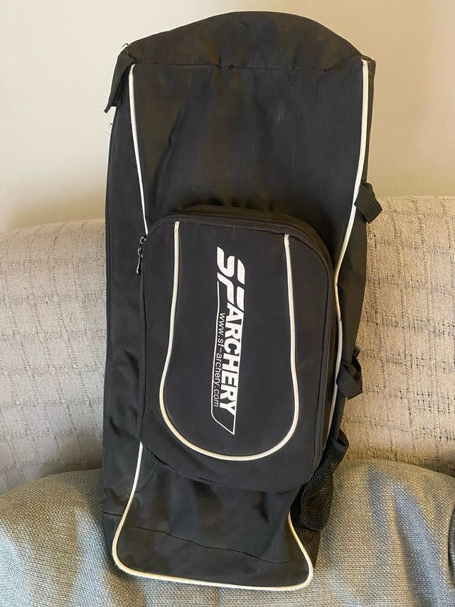 Detalles del productoMochila negra de la marca SF Archery, diseñada para el tiro con arco ideal para Arcos Recurvos Cuenta con un bolsillo frontal con cremallera y ribetes blancos.