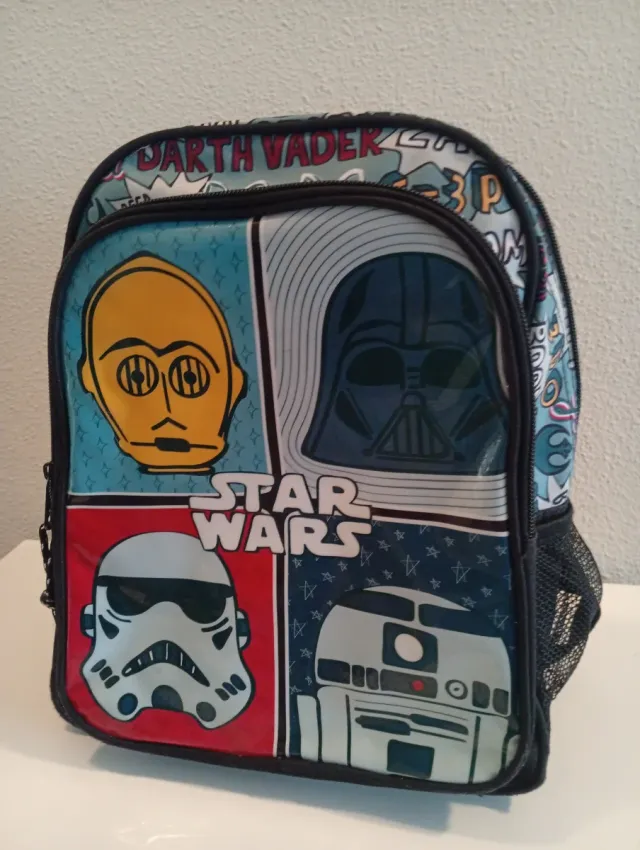 Mochila infantil con diseño de Star Wars, adaptable a carro. COMO NUEVA - Personajes icónicos de Star Wars. - Estampado colorido y llamativo.