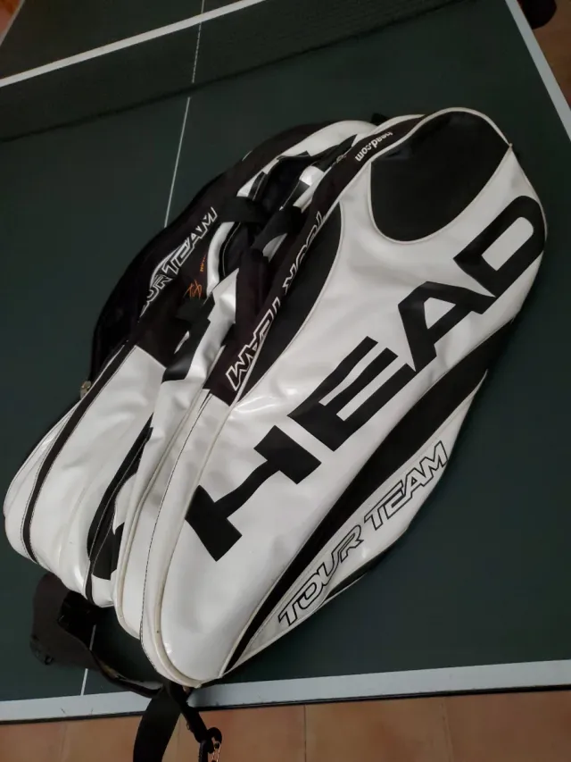 Mochila de tenis de la marca Head, modelo Tour Team. - Capacidad para 12 raquetas. - Diseño en blanco y negro. - Logo de Head y Tour Team visibles.