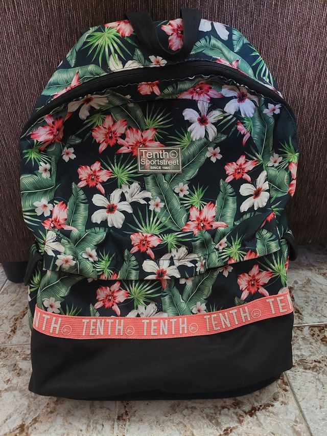 Mochila Tenth Sportsreet con estampado floral. Está en buen estado y lista para usar. - Diseño con flores tropicales. - Marca: Tenth Sportsreet. - Color: Negro con detalles coral.