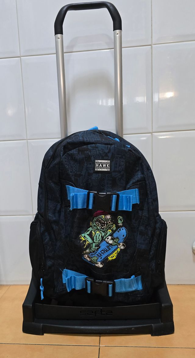 Detalles del productoMochila escolar con ruedas de la marca Safta, diseño Tony Hawk. Está en perfecto estado interior, exterior, correas, cremalleras.