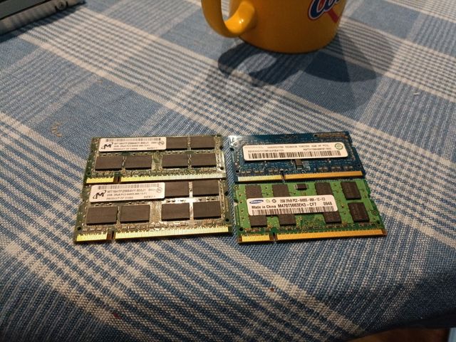 Cuatro módulos de memoria RAM Dos MT16HTF255664HY-800J1 de 2gb Un Samsung M470T5663EH3-CF7 de 2gb Un Ramaxel RMT3170MN68F9F-1600 de 4gb