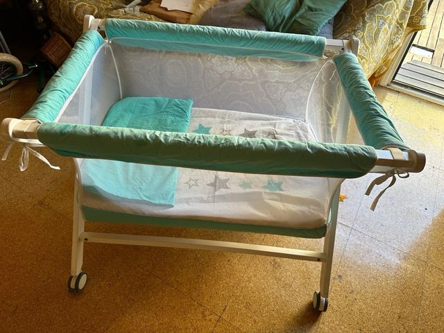 Moisés de estructura blanca y funda nórdica a juego. Una sábana, 2 muselinas y un protector de colchon. En buen estado