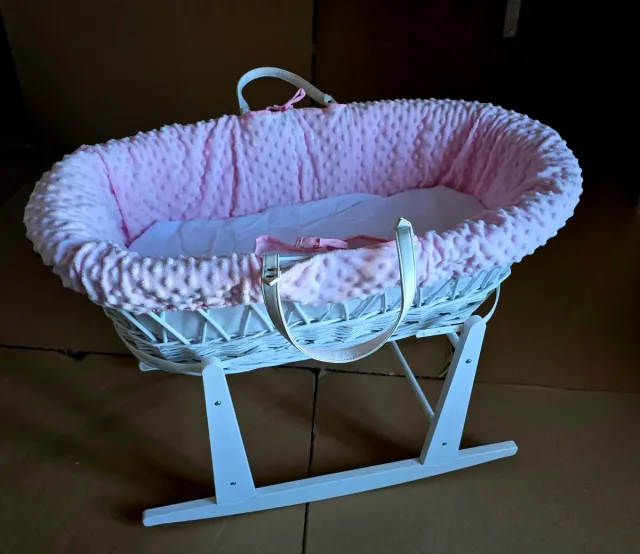 Moisés blanco con un suave interior rosa. - Cesta de mimbre blanco. - Forro interior rosa con textura. - Asas de transporte blancas. - Base balancín blanca.