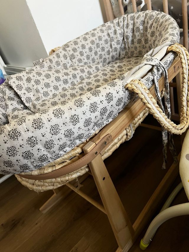 Detalles del productoMoises de madera con vestiduras de la marca pasito a pasito.