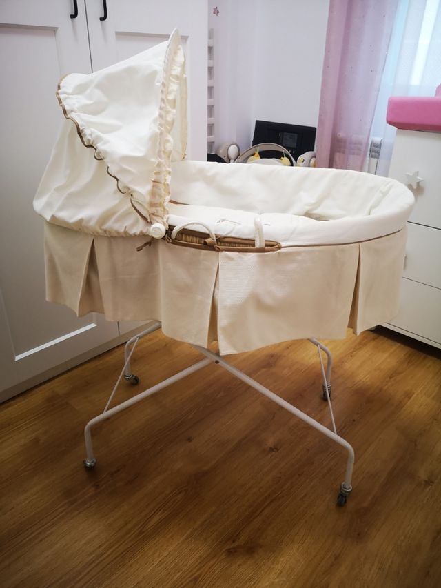 Detalles del productoSe vende moisés de bebé 86x56. Tiene asas, y ruedas para llevar de una habitación a otra cómodamente. Se regala colchón, vestiduras, 2 sábanas blancas y mantita rosa. Es ideal para los primeros meses. Es bastante alto por lo que es muy cómodo meter al bebé. Esta impecable. SOLO VENTA EN PERSONA DEBIDO AL VOLUMEN Y LA FRAGILIDAD DEL PRODUCTO. Medidas del producto