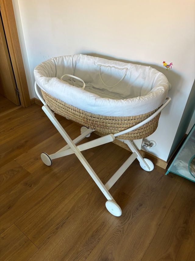 Detalles del productoMoisés cuna con un diseño natural en mimbre y estructura de madera blanca.