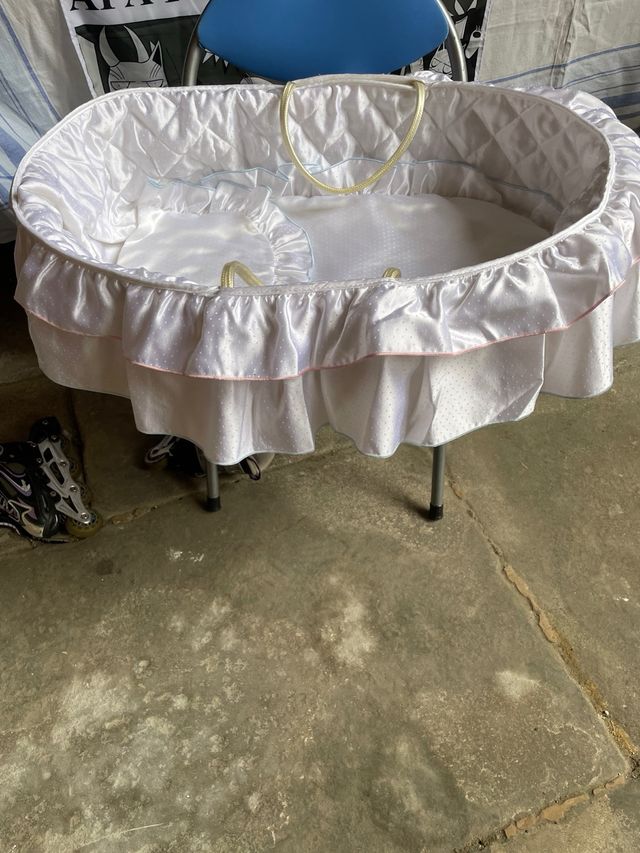 Moisés para bebé con vestidura completa. - Diseño ovalado. - Vestidura blanca con detalles de lunares y volantes. - Incluye capota y asas de transporte.