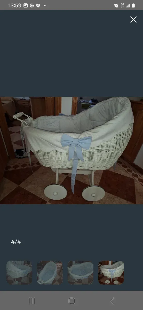 Moisés de mimbre y madera en muy buen estado, incluye vestimenta. - Cuna de mimbre. - Base de madera. - Vestimenta incluida.