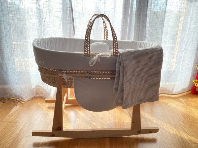 Detalles del productoMoisés para bebé de mimbre hecho a mano y base balancín en madera de haya de la marca Cucos&Baby.