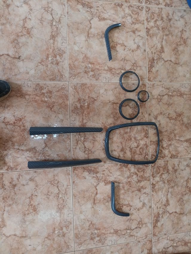 Detalles del productoJuego de molduras para salpicadero de Peugeot 207. Están realizadas con un diseño de imitación carbono. Se incluyen todas las piezas que se ven en la imagen: dos piezas largas, dos piezas cortas, tres anillos y dos piezas curvas. Ideales para darle un toque deportivo al interior de tu coche.