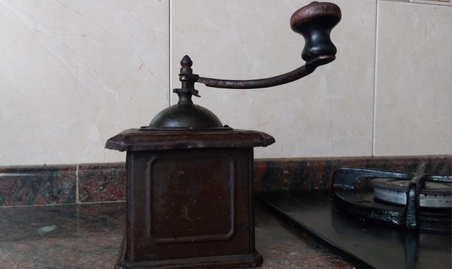 Molinillo de Café Antiguo, todo el molinillo de metal. Color marrón oscuro. Objeto de Coleccionista.