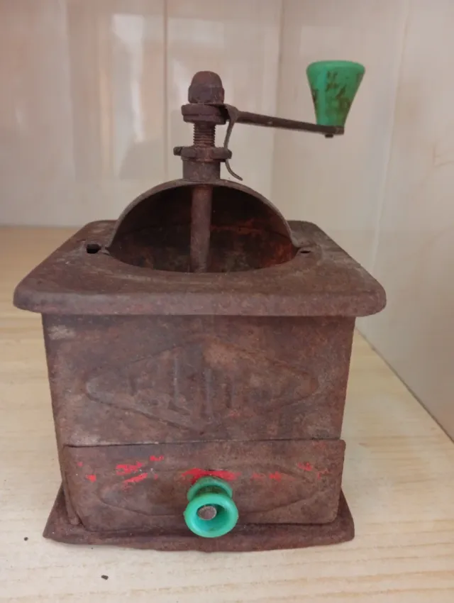 Detalles del productoMolinillo de café vintage, ideal para coleccionistas o como pieza decorativa.