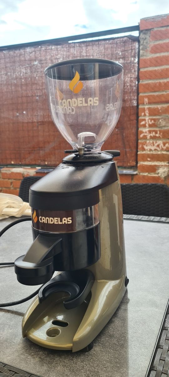 Molinillo de café de la marca Candelas. - Diseño moderno en color beige y negro. - Depósito superior transparente. - Falta una bandejita de abajo.