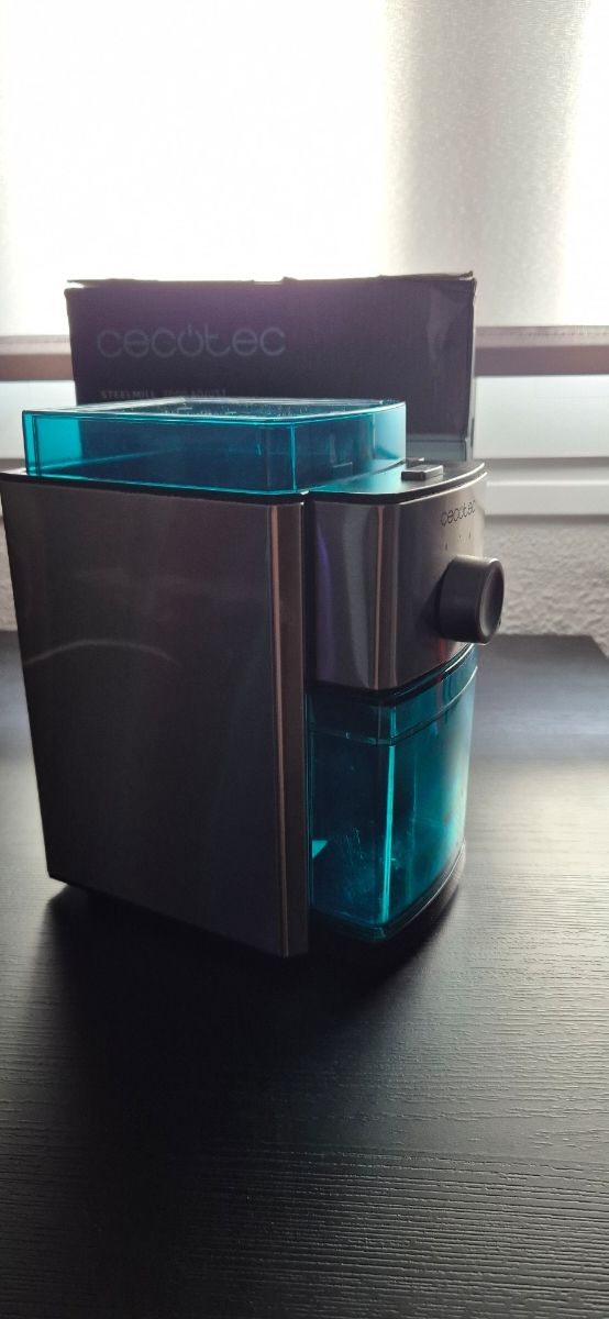 Molinillo de café electrónico con acabado en acero inoxidable y detalles en color azul. - Diseño moderno. - Tapa superior transparente.