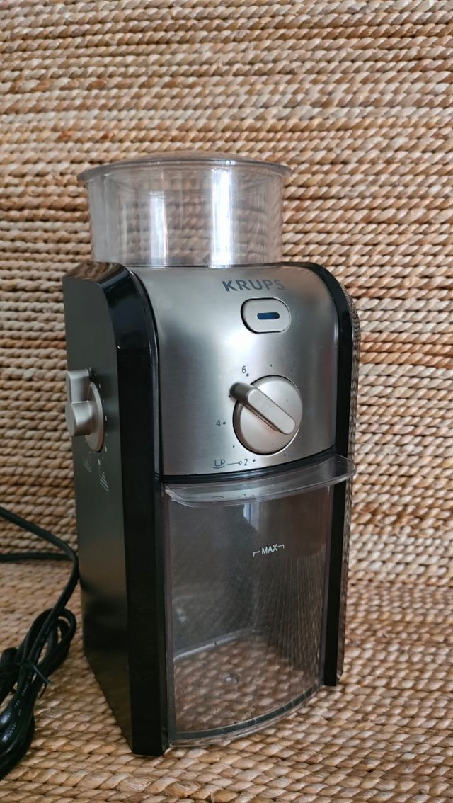 Molinillo de café KRUPS en buen estado. Es compacto y fácil de usar. - Marca: Krups - Molinillo de café - Diseño elegante en tonos plata y negro - Ajustes de molienda