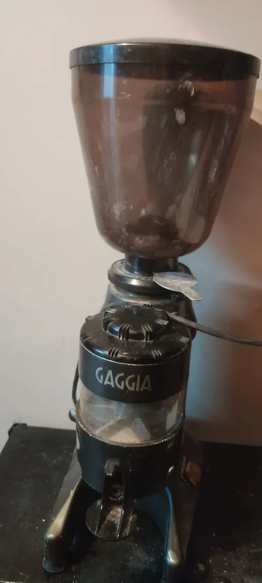 Molino de café Gaggia en color negro. - Depósito superior. - Ajuste de molienda. - Contenedor inferior.