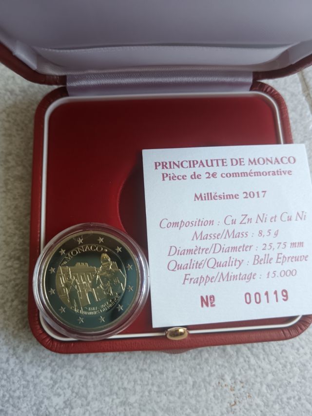 Detalles del productoMoneda conmemorativa de Mónaco del año 2017 carabineros del Príncipe calidad Proof con certificado de autenticidad estuche y caja blanca en perfecto estado número bajo 119.