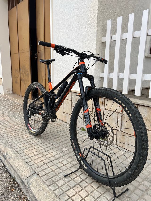 Detalles del productoBicicleta de montaña con doble suspensión en color naranja y negro. Ideal para terrenos irregulares.