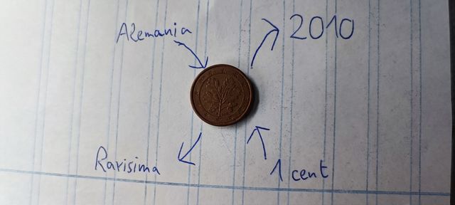 Moneda de 1 cent de Alemania del año 2010 en la que sale una hoja. Moneda super rarísima de encontrar.