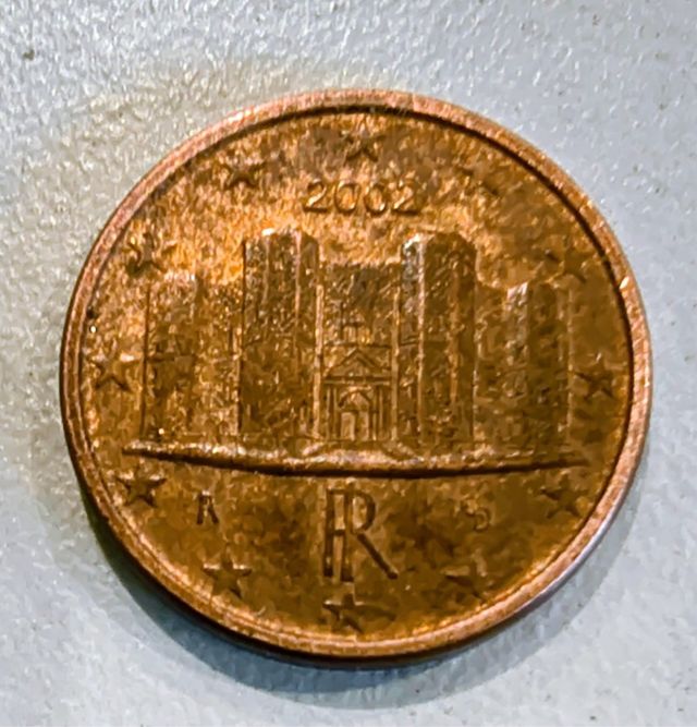 Moneda de 1 céntimo conmemorativa del año 2002. - Diseño con edificios y estrellas. - Detalle de la letra R en el centro.