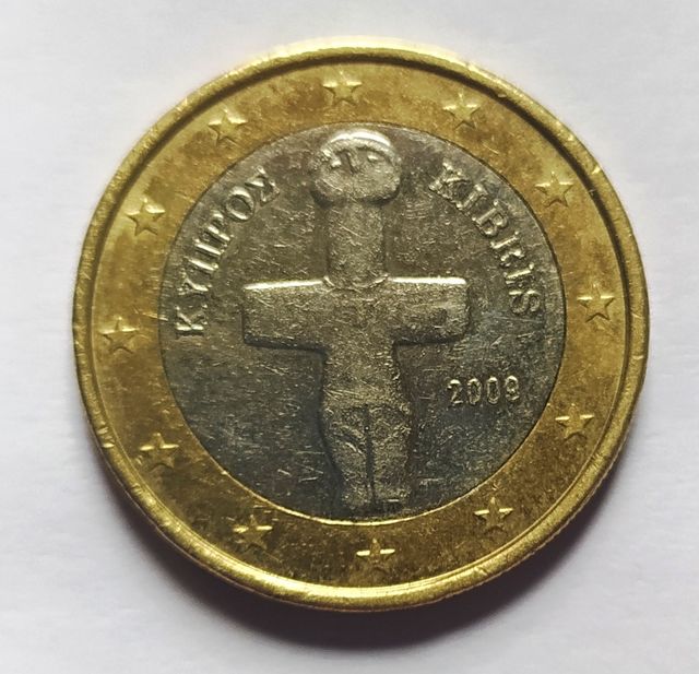 Moneda de 1 euro de Chipre del año 2009. - Diseño con el ídolo de Pomos. - Borde exterior con estrellas. - Año de acuñación: 2009.