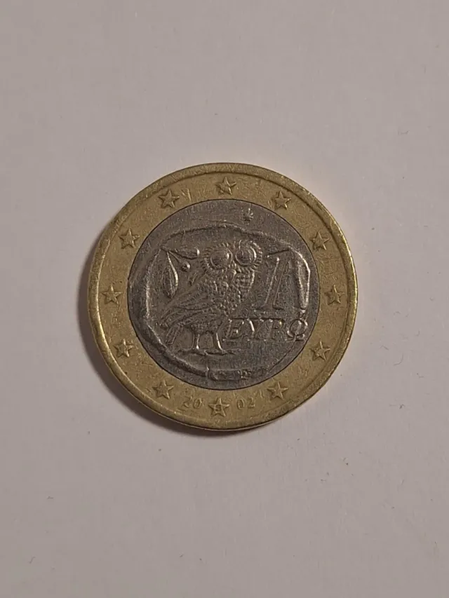 Moneda de 1 euro de Grecia conmemorativa del año 2002. Presenta un diseño clásico. - Canto con estrellas. - Diseño de búho. - Año de acuñación: 2002.