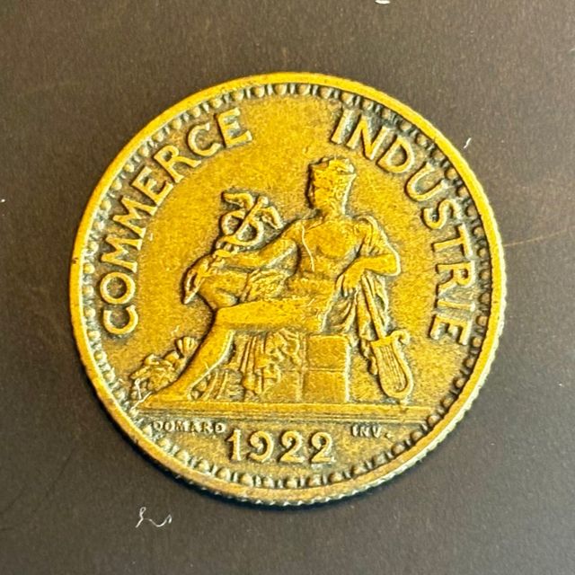 Detalles del productoMoneda original francesa de 1 franco acuñada en 1922, perteneciente a la serie “Chambres de Commerce de France”. En el anverso se aprecia la alegoría del Comercio e Industria con la inscripción “COMMERCE INDUSTRIE”, y en el reverso el texto “BON POUR 1 FRANC”.