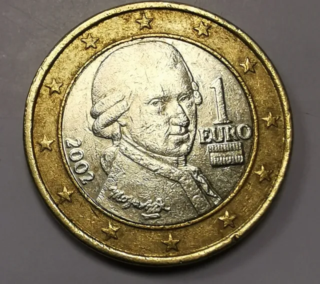 Moneda conmemorativa de 1 Euro del año 2002. Diseño de Wolfgang Amadeus Mozart. Austria.