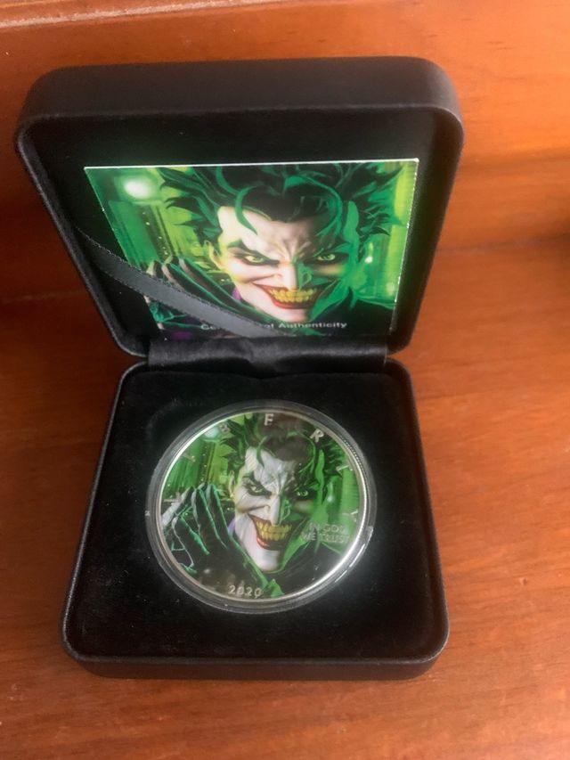 Detalles del producto1 onza plata 999 eagle USA 2020 con la figura del JOKER coloreada , tirada muy corta de solo 100 unidades esta es la numero53 con certificado y caja.