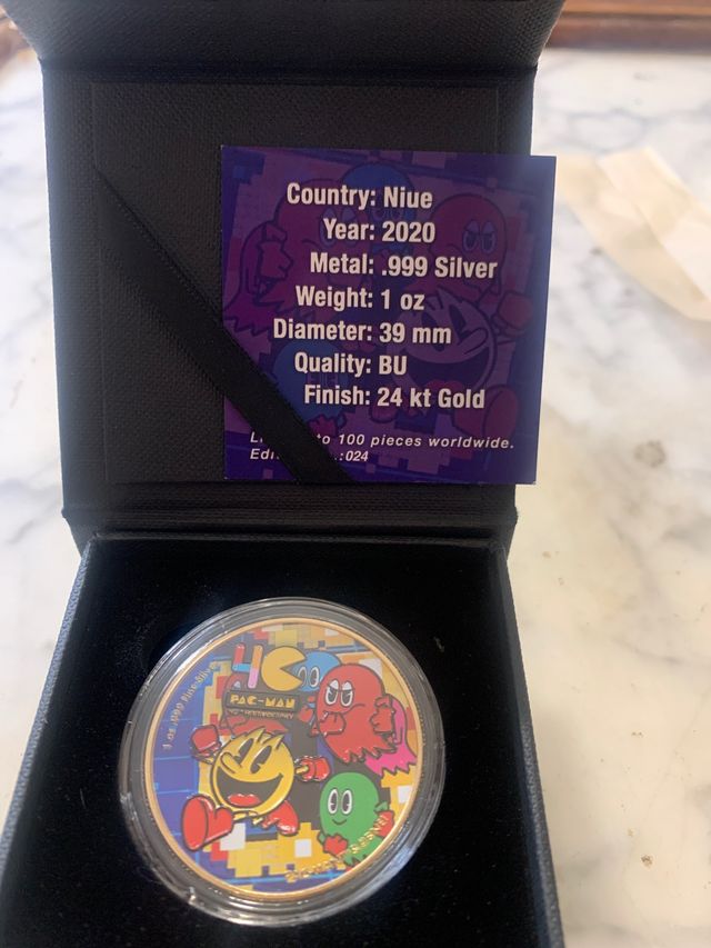 Detalles del producto1 onza plata 999 NIVE año 2020 , Pac man color acabado oro 24 kt. Solo cien unidades con caja y certificado.