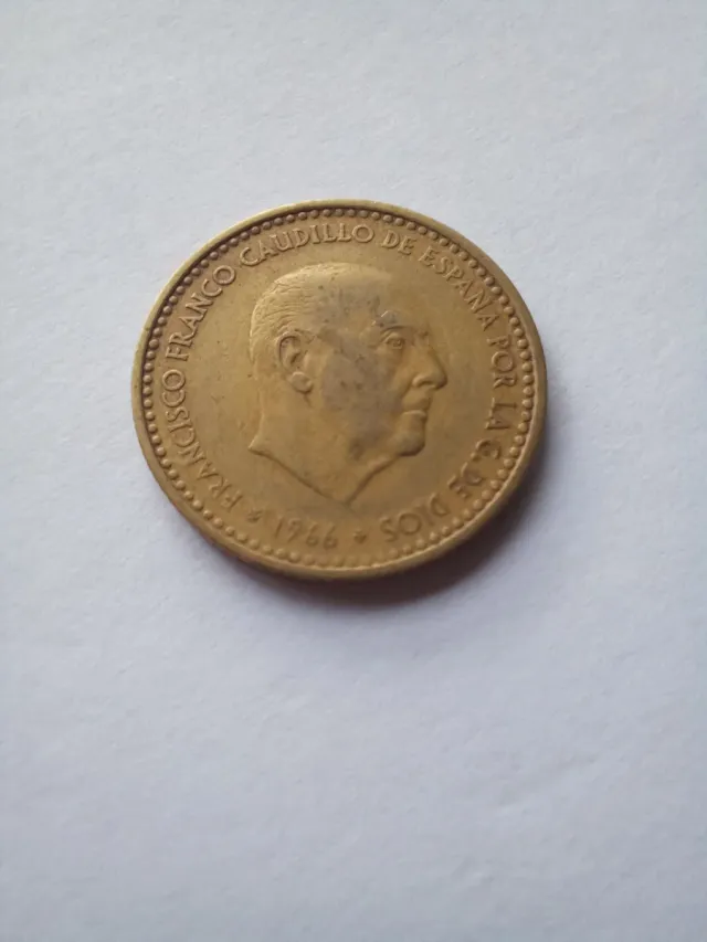Moneda de 1 peseta del año 1966. - Anverso: Retrato de Francisco Franco Caudillo de España. - Reverso: Estrella 70 y Dios - Patria - Rey. - Año: 1966.