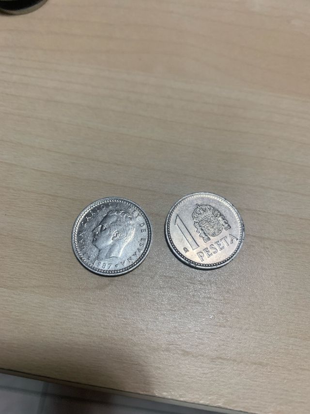 Moneda de 1 peseta del año 1987. - Diseño con retrato. - Reverso con escudo y valor.