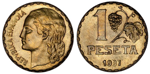 - Reverso: 1 PESETA y 1937 con un racimo de uvas y hoja.