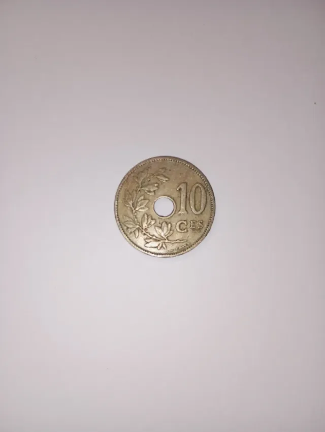 Moneda antigua del Reino de Bélgica con valor de 10 céntimos. - Año de acuñación: 1928. - Diseño con ramas y flores. - Posee un agujero central característico.