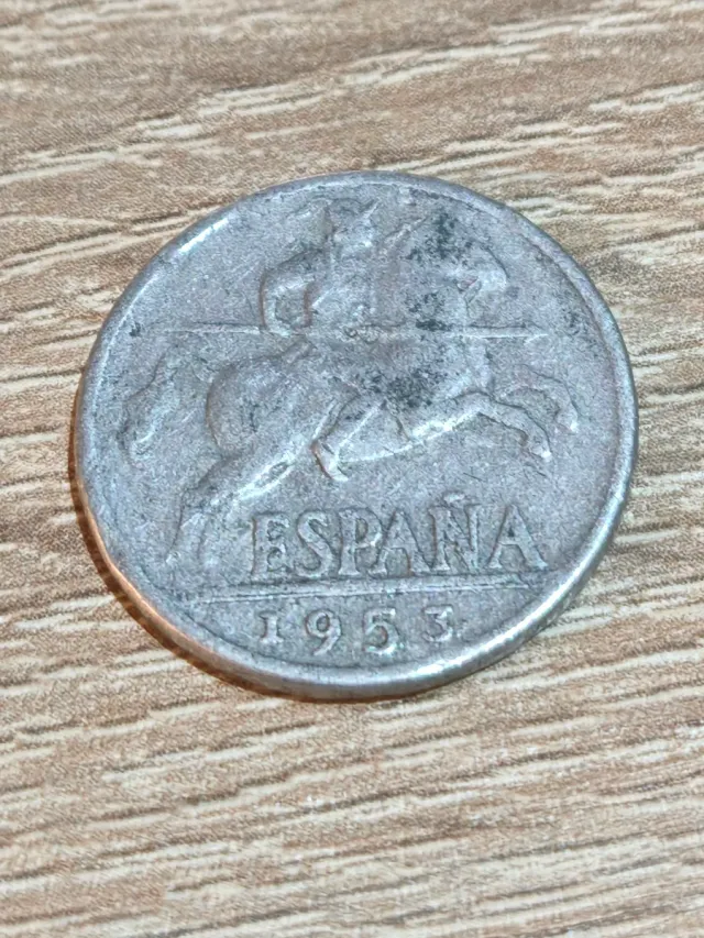 Moneda de 10 céntimos de España del año 1953. Presenta un diseño con un jinete a caballo. - Año: 1953 - País: España - Denominación: 10 céntimos