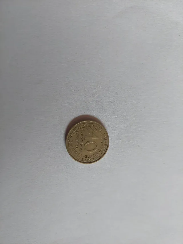 Moneda de 10 céntimos de Francia del año 1963. - Diseño con laureles. - Inscripción Liberté Égalité Fraternité.