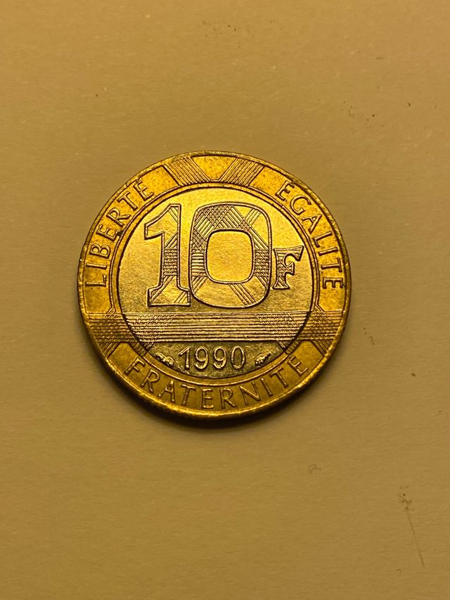 Moneda de 10 francos franceses del año 1990. - Diseño con Liberté, Égalité, Fraternité. - Valor nominal de 10F.