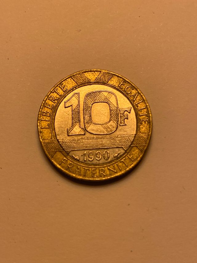 Moneda de 10 francos franceses del año 1990. - Diseño con Liberté, Égalité, Fraternité. - Inscripción 1990 en el centro.