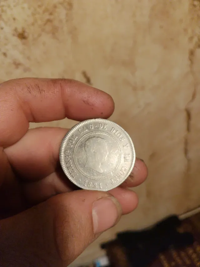 Moneda antigua de 10 Reales del año 1821. - Canto con inscripciones. - Diseño con perfil de personaje histórico.