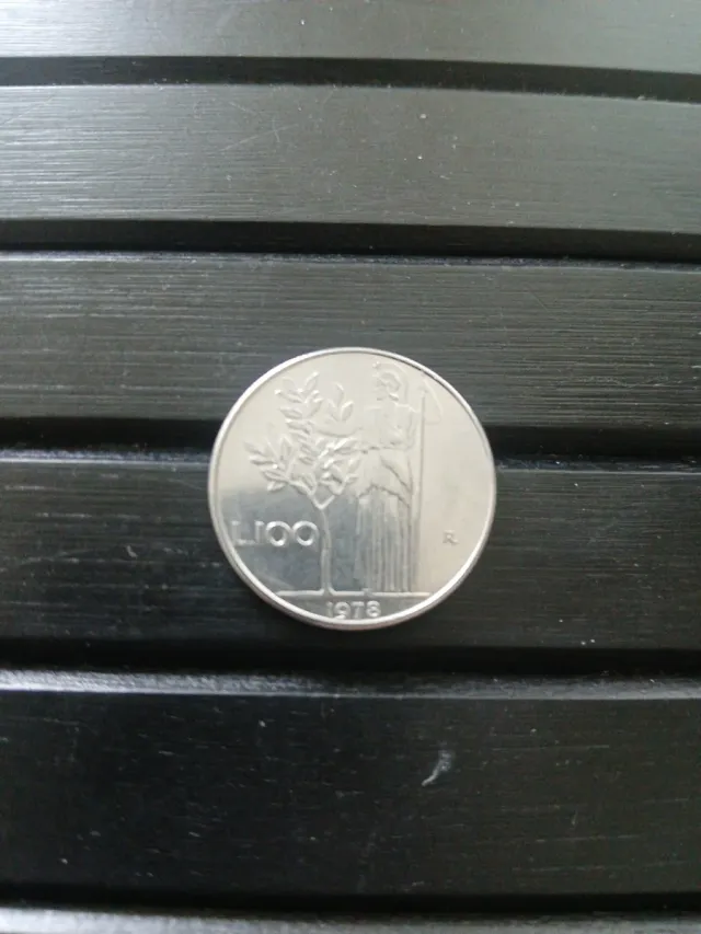 Moneda italiana de 100 Lire del año 1978. - Diseño con figura femenina y ramas. - Inscripción LIRE y 1978.