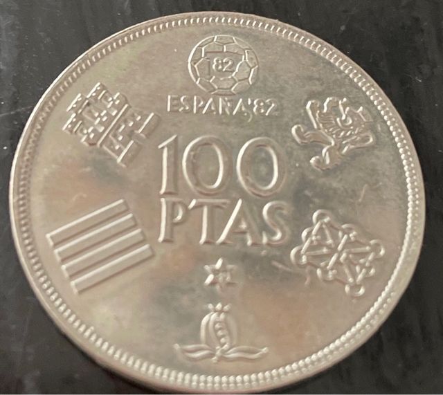 Moneda conmemorativa de 100 pesetas de España 1982. - Diseño con el escudo de España. - Motivo del Mundial de Fútbol 1982.