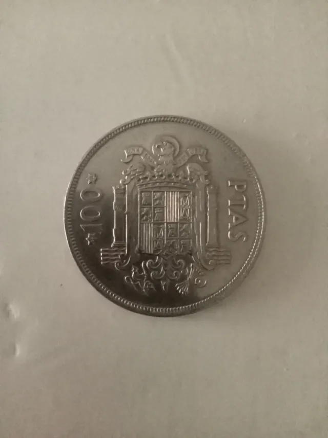 Moneda conmemorativa de 100 pesetas de Juan Carlos I, acuñada en el año 1975. - Diseño del escudo de España. - Inscripción 100 PTAS.