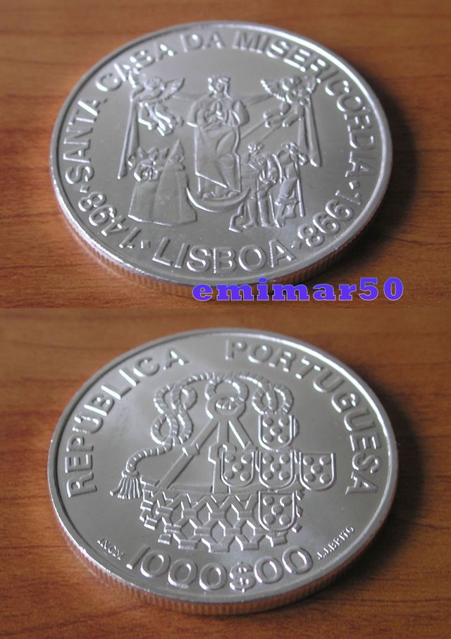 Detalles del productoMoneda de 1000 Escudos de Plata del año 1998 de Portugal, nueva, sin circular, conmemorativa de la Santa Casa de Misericordia. Tiene una circunferencia de 4 cm. canto estriado y un peso aprox. de 27 a 28 Gr.