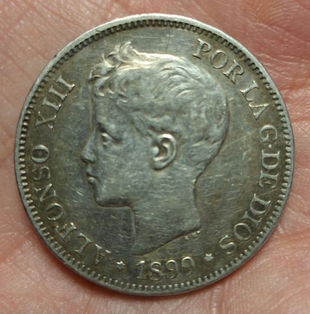 Preciosa moneda de plata de Alfonso XIII, fechada en 1899. De cuando Alfonso XIII era menor de edad todavía.
