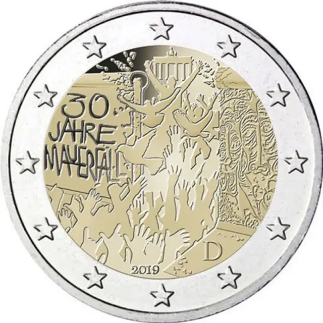 Moneda dedicada al «300 aniversario de la Caída del Muro de Berlín». El motivo representa el muro de Berlín, abierto en su centro, de forma que deja pasar a unas palomas (símbolos del apaciguamiento internacional) y a una multitud jubilosa. En el fondo figura la Puerta de Brandeburgo, el símbolo por excelencia de Berlín. La leyenda «30 Jahre Mauerfall» (treinta años de la caída del muro de Berlín) está inscrita en un lado de la pared.
