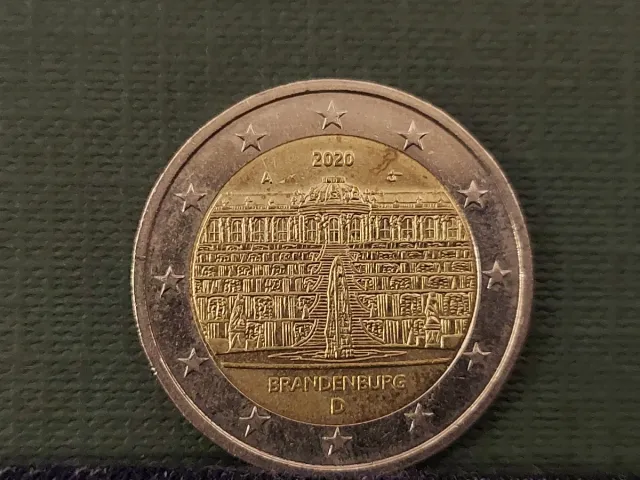 Moneda conmemorativa de 2 euros de Alemania, año 2020. - Diseño dedicado a Brandeburgo. - Incluye el año de emisión. - Símbolo de Alemania 'D'.